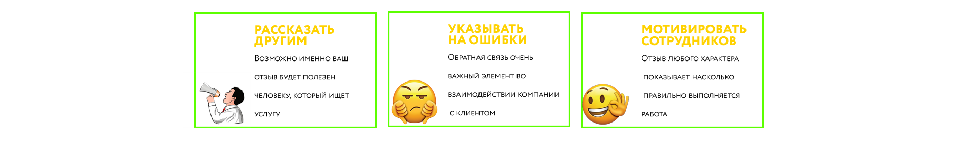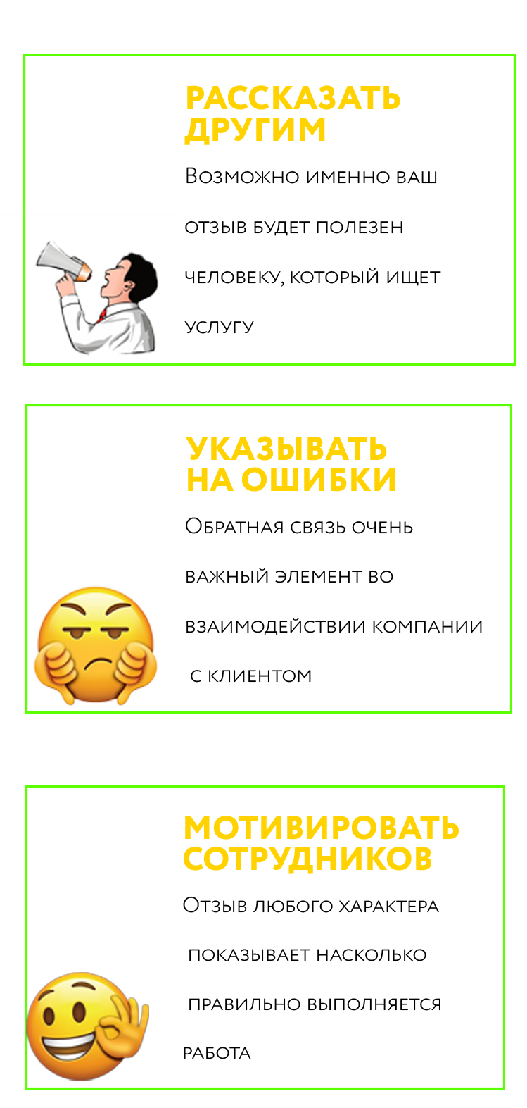 Отзыв является сильным мотивирующим средством, корректирующим нашу работу. Негативные показывают, где еще нужно приложить усилия и устранить негативные факторы для наших клиентов. Положительные поднимают настроение и говорят, что в этом направлении у нас всё получается правильно.